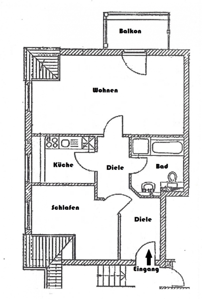 Ausstattung der Immobilie 2 Zimmer, Küche, Diele, Bad, Balkon, Kellerraum, Tiefgaragenplatz
